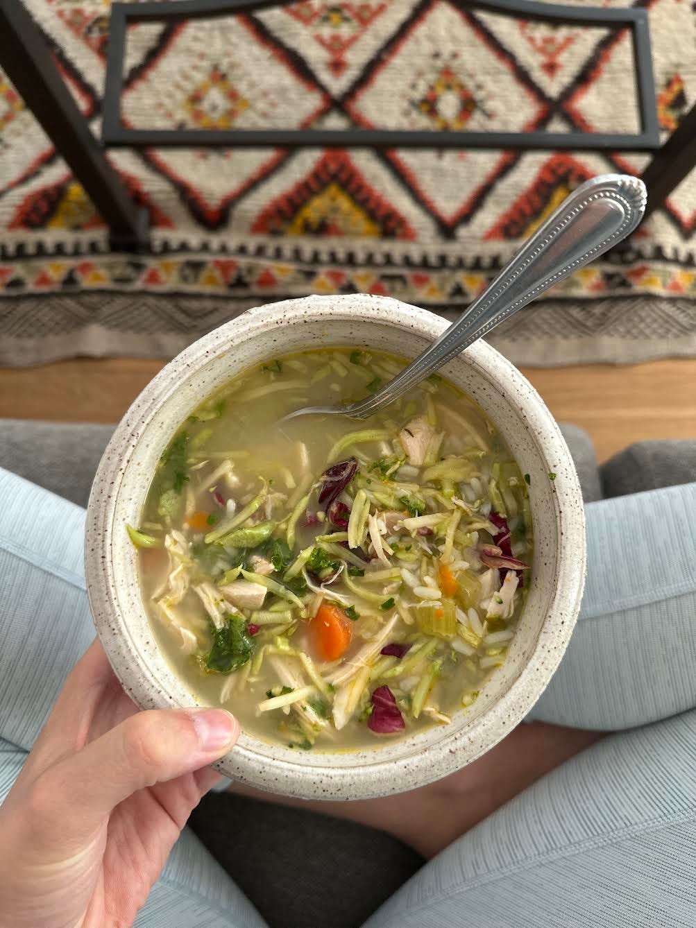 Another go-to is chicken and rice soup. I add extra rotisserie chicken and vegetables, plus little cubes of cheddar cheese because that’s how my mom always used to give us soup when we were kids. It feels bizarre to be babying myself as I crawl closer to the finish line that separates me from my own impending identity as a mother. And yet, it’s oddly fitting, no?